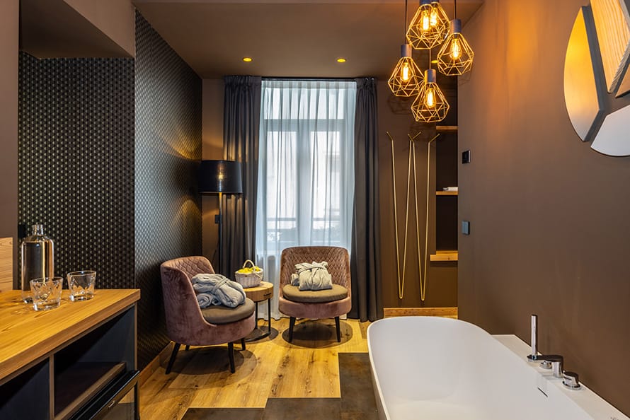The Junior Suites with sauna are modern and elegant, where every detail is designed to welcome guests with a refined style to create an atmosphere of relaxing well-being.